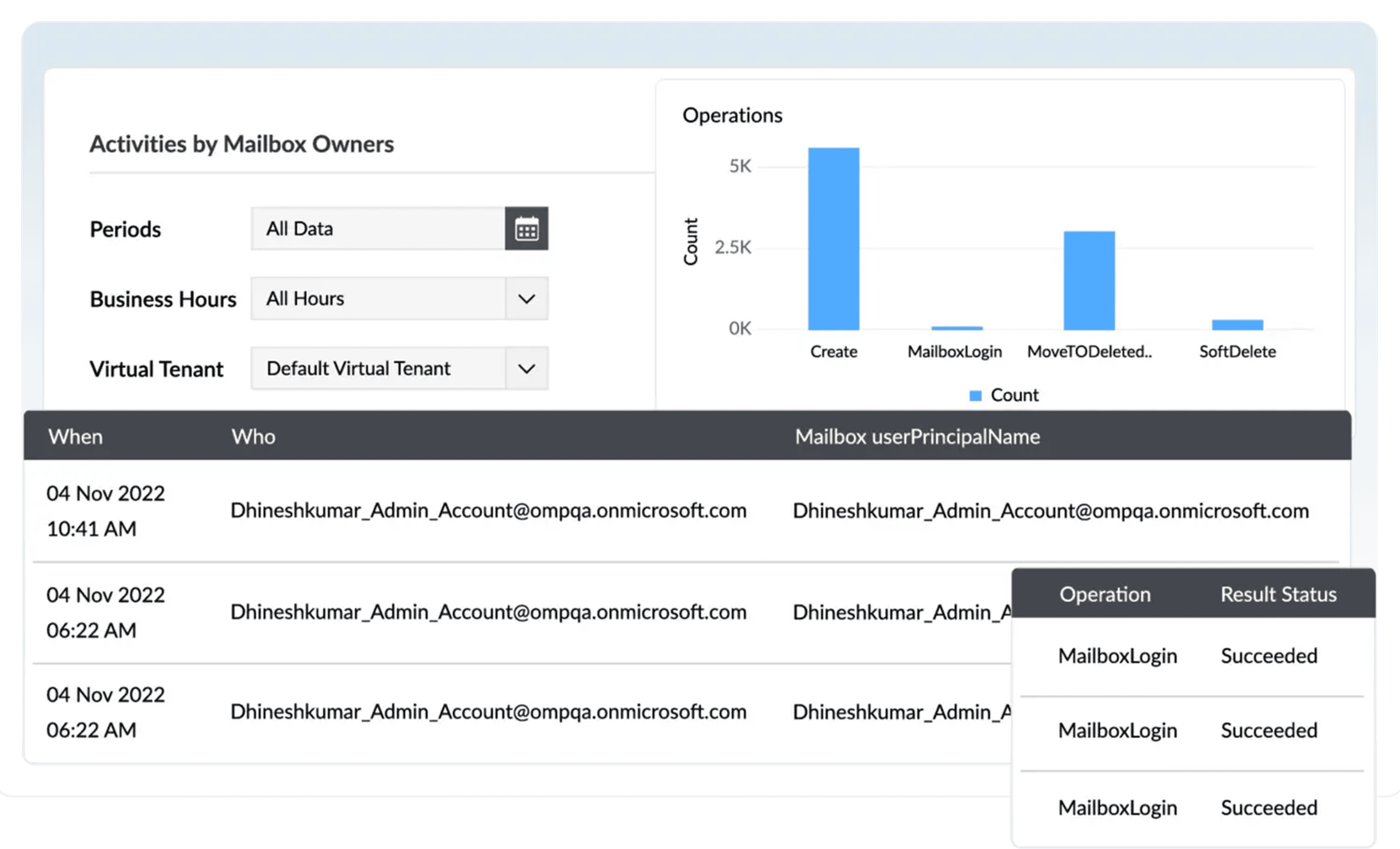 Track activities of mailbox owners, non-owners, and delegates, including mailbox logon activity, send-as right usage, and more.